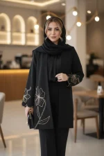 یک مانتوی خوش‌دوخت با گلدوزی ظریف روی کار؛ شیک، کاربردی و همیشه ترند، مناسب استایل عیدانه و روزمره.