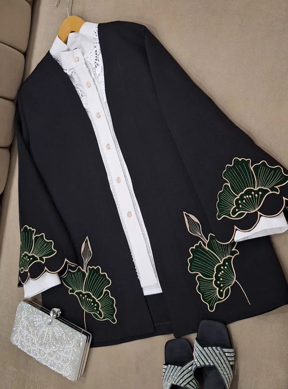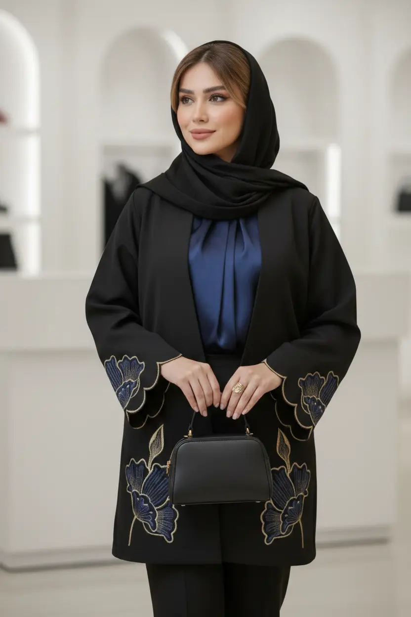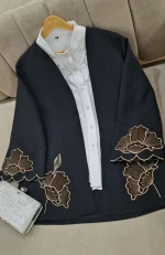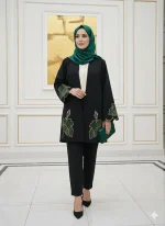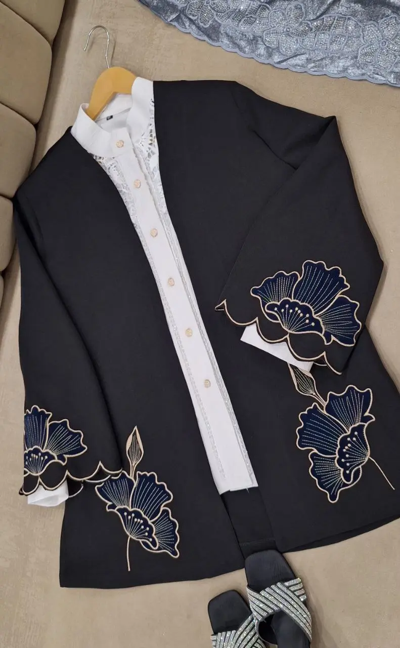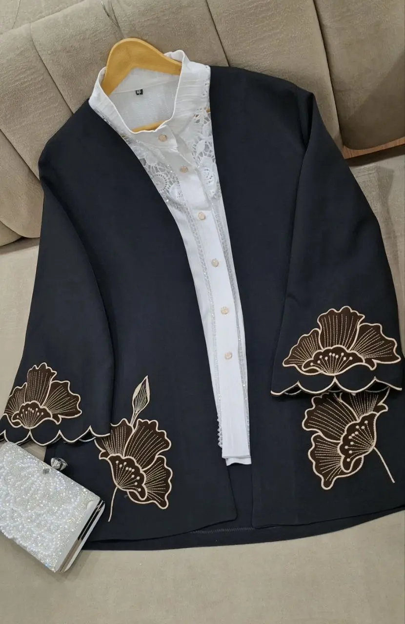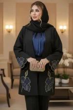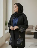 مانتویی خوش‌دوخت با تیکه دوزی جیر و گلدوزی ظریف روی کار ✨