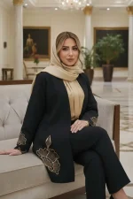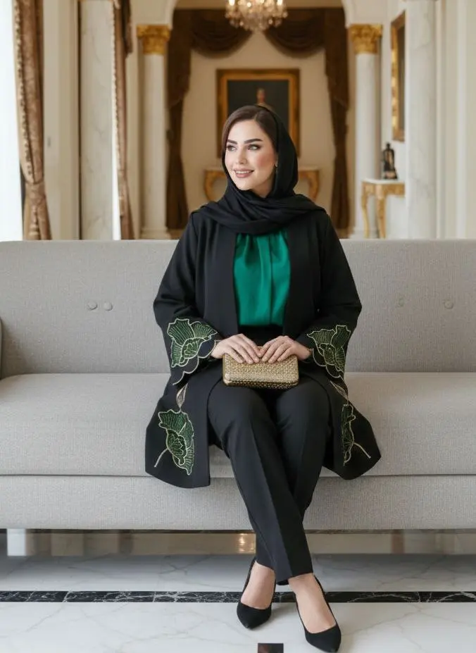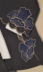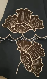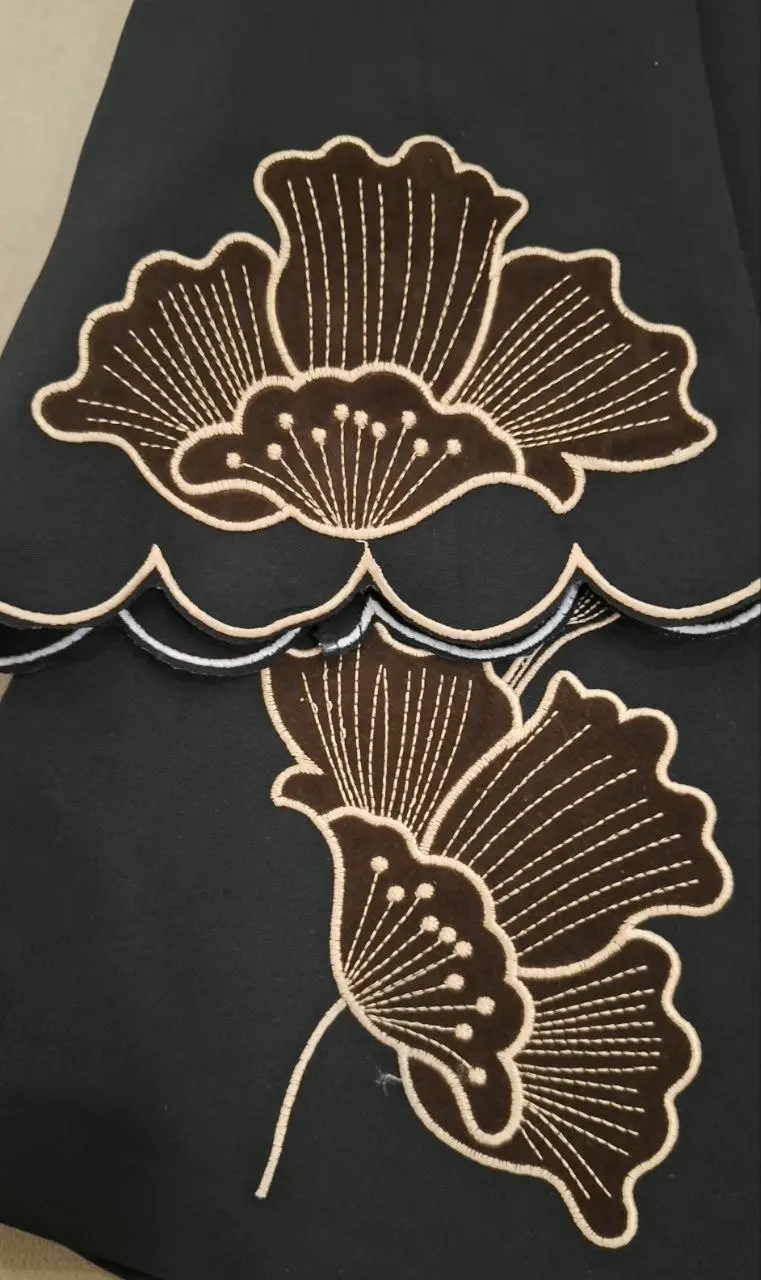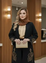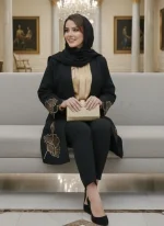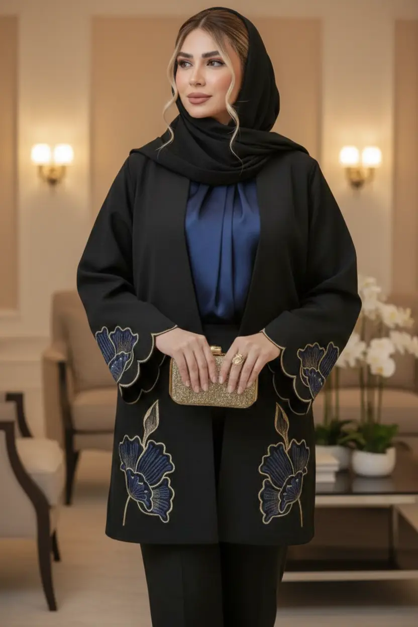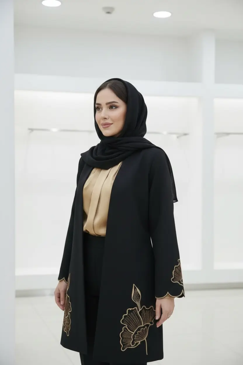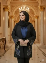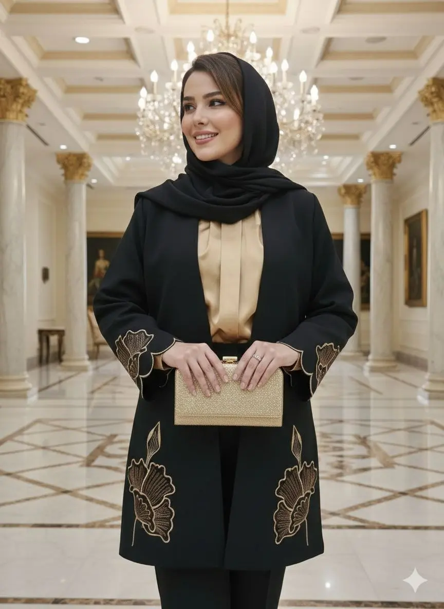 مانتویی خوش‌دوخت با تیکه دوزی جیر و گلدوزی ظریف روی کار ✨