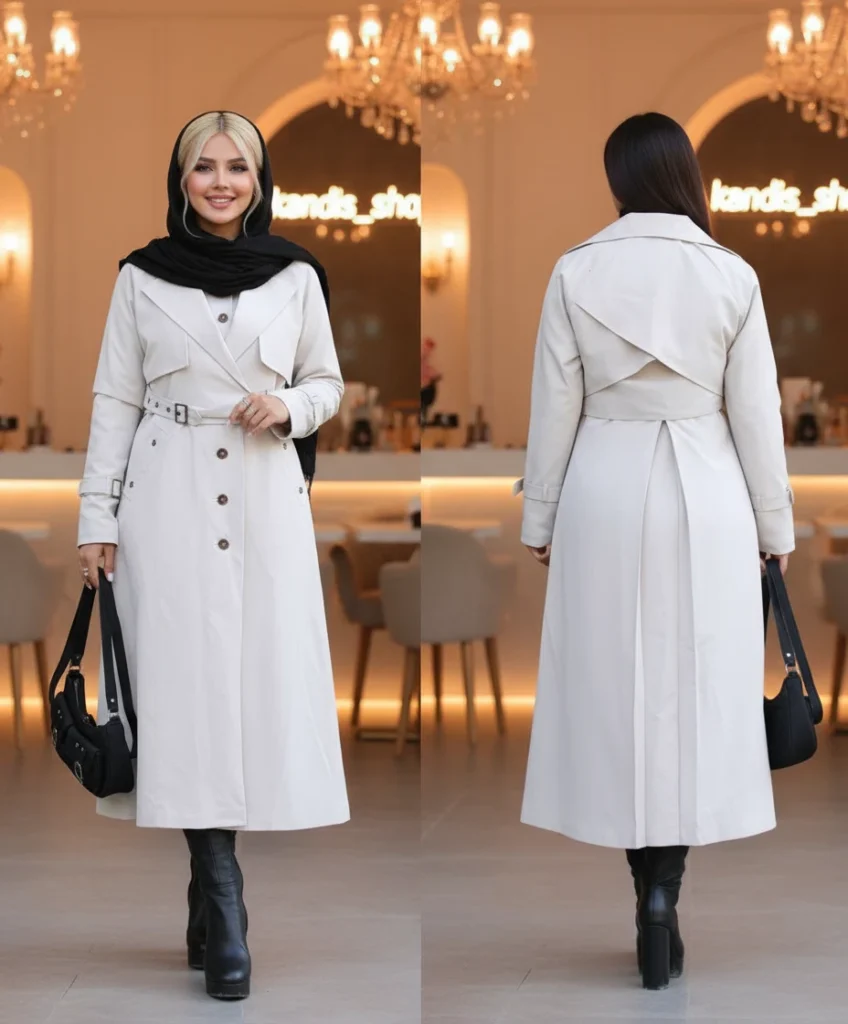 مانتوی بارانی بلند بسیار شیک و با کیفیت مناسب تا سایز بزرگ 52 در چند رنگ زیبا برای خانم های شیک پوش